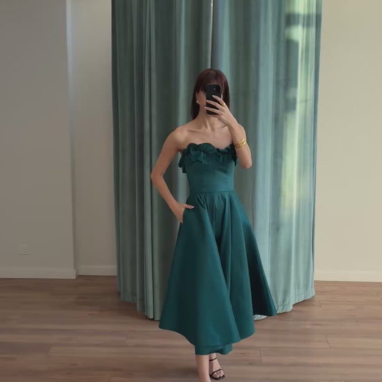 Midi dress made from taffeta fabric featuring a strapless bodice with a decorative neckline detail. The voluminous skirt adds elegance and movement.