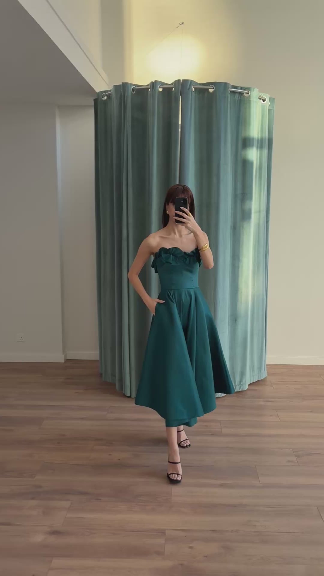 Midi φόρεμα από ύφασμα ταφτά με strapless μπούστο και διακοσμητική λεπτομέρεια στο ντεκολτέ. Η πλούσια φούστα δημιουργεί όγκο και κομψή κίνηση.