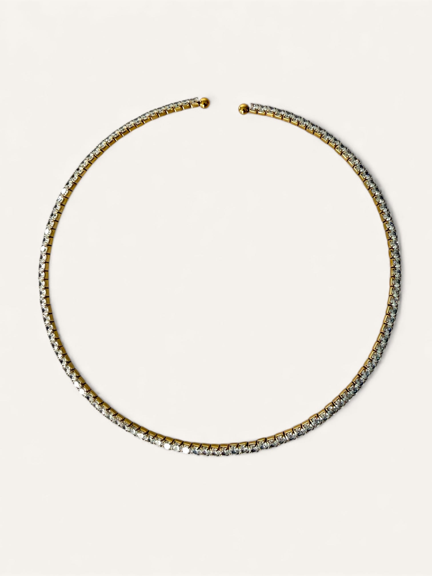 Λεπτό, άκαμπτο choker με σειρά από μικρές λαμπερές πέτρες σε όλη του την καμπύλη. Ακουμπά απαλά στον λαιμό και δίνει μια καθαρή, minimal λάμψη που τραβάει το βλέμμα χωρίς υπερβολές.