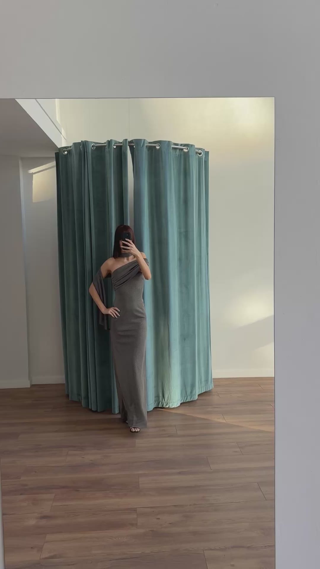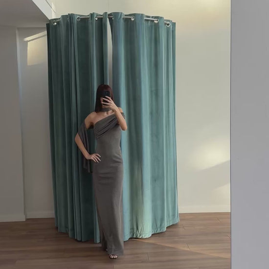 Μακρύ στράπλες φόρεμα από ελαστικό glitter ύφασμα, με ενσωματωμένο φουλάρι στο πλάι που φοριέται είτε γύρω από τον λαιμό είτε ριχτό σαν κάπα.