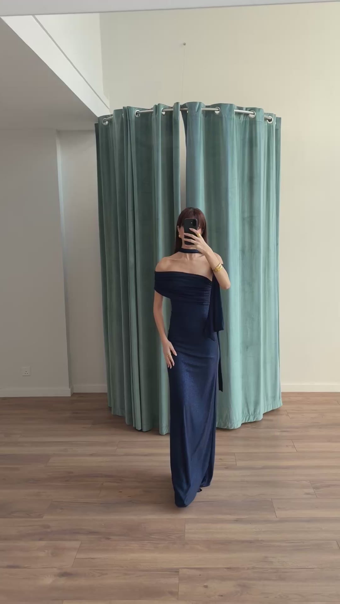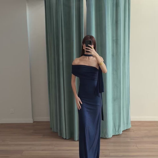 Long strapless dress in stretch glitter fabric, featuring an attached scarf on the side that can be styled as a neck tie or draped like a cape.