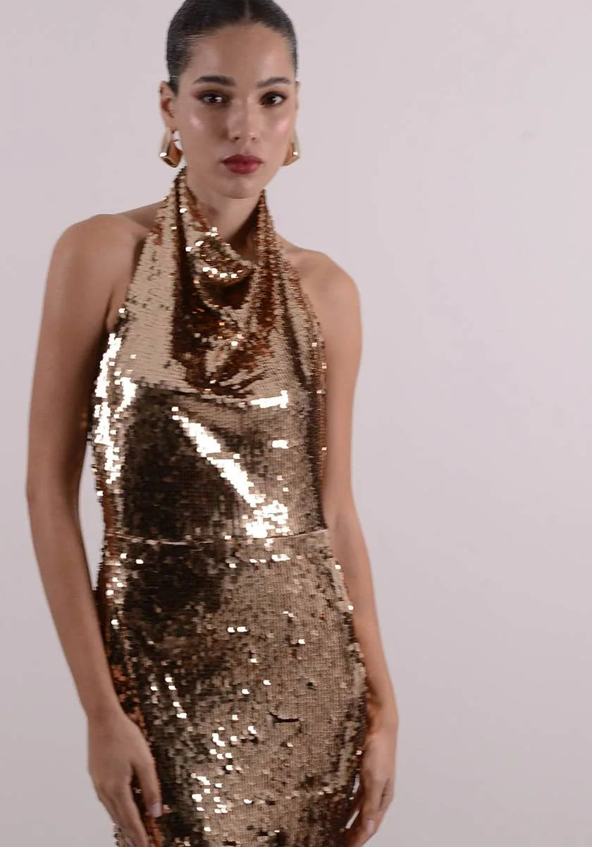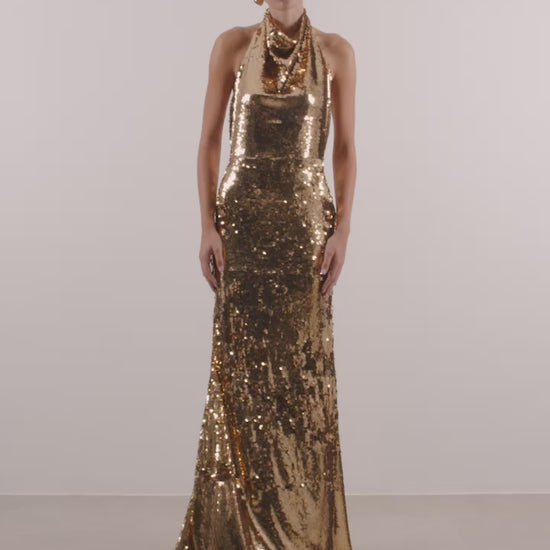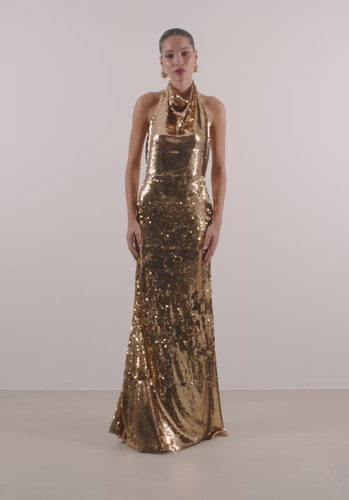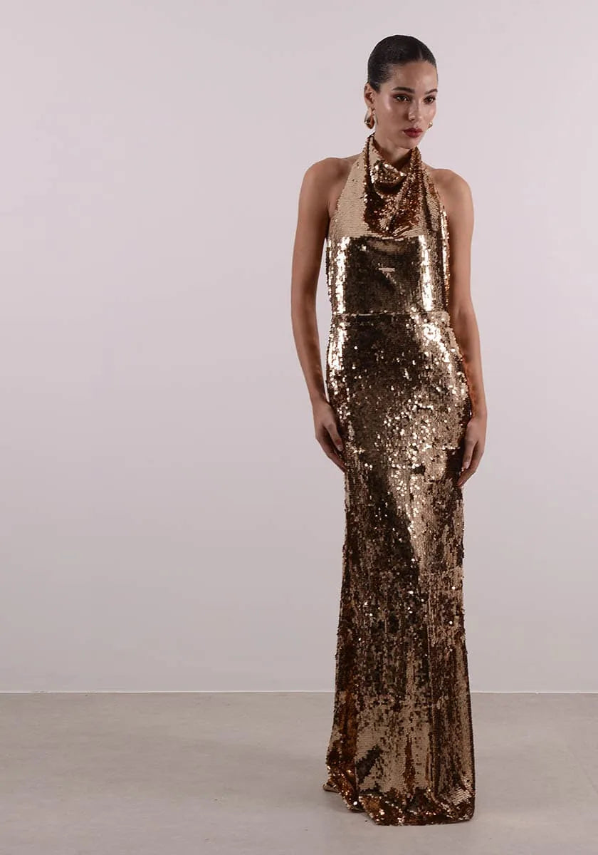 Shimmer down the aisle with our Marilyn gold sequin dress. The maxi-length style features an all-over sequined design, with a halter neck silhouette. Details with gold buttons on the back of neck and closure with zipper on the back of the waist.