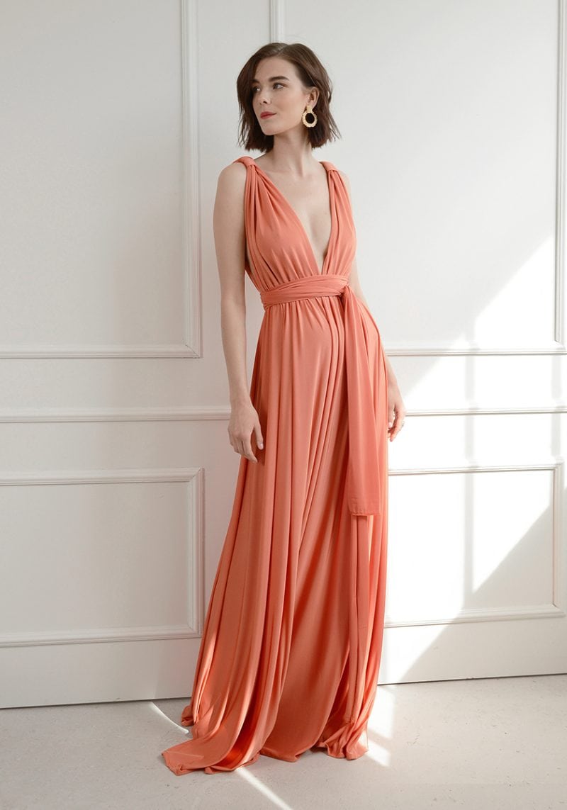 Φόρεμα από ύφασμα crystal, με βαθύ V, ανοίγματα στα πλάγια και φούστα σε γραμμή Α.