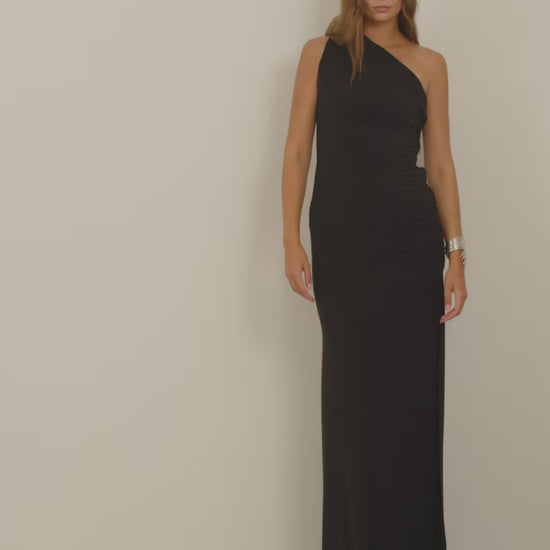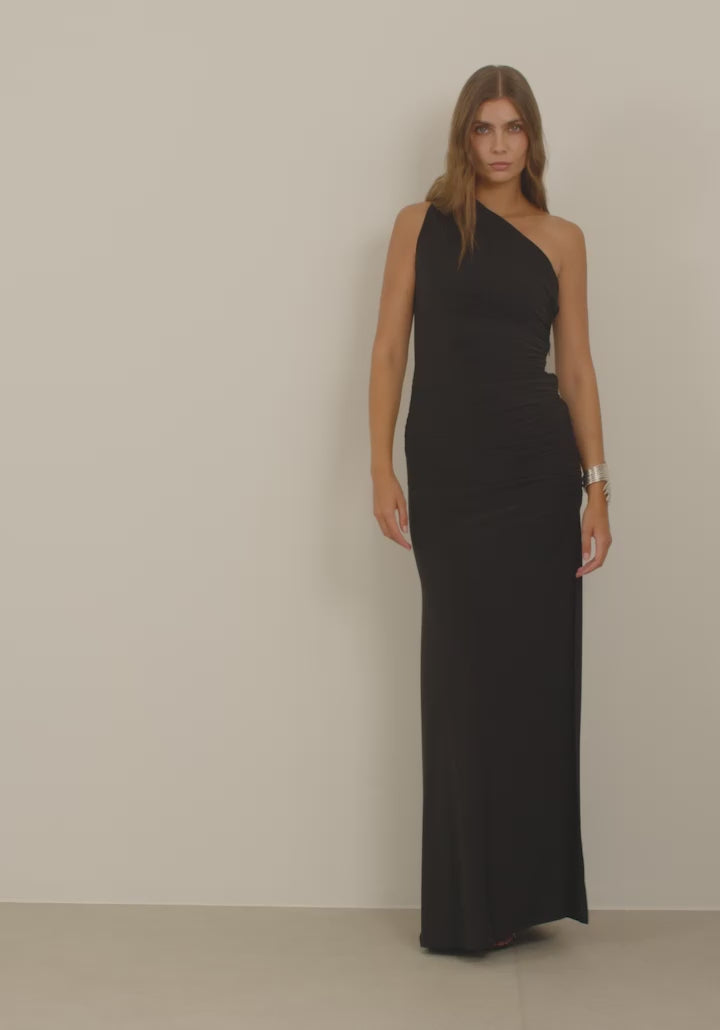 Μακρύ φόρεμα με έναν ώμο από ελαστικό ύφασμα. Λεπτομέρειες με σούρες και φερμουάρ στο πλάι. Φούστα σε γοργονέ γραμμή.
