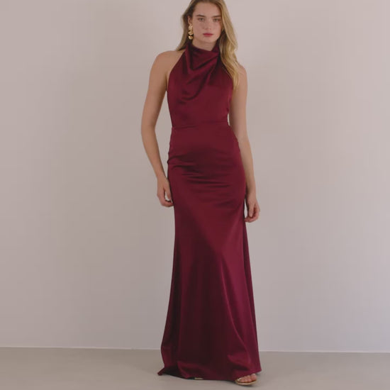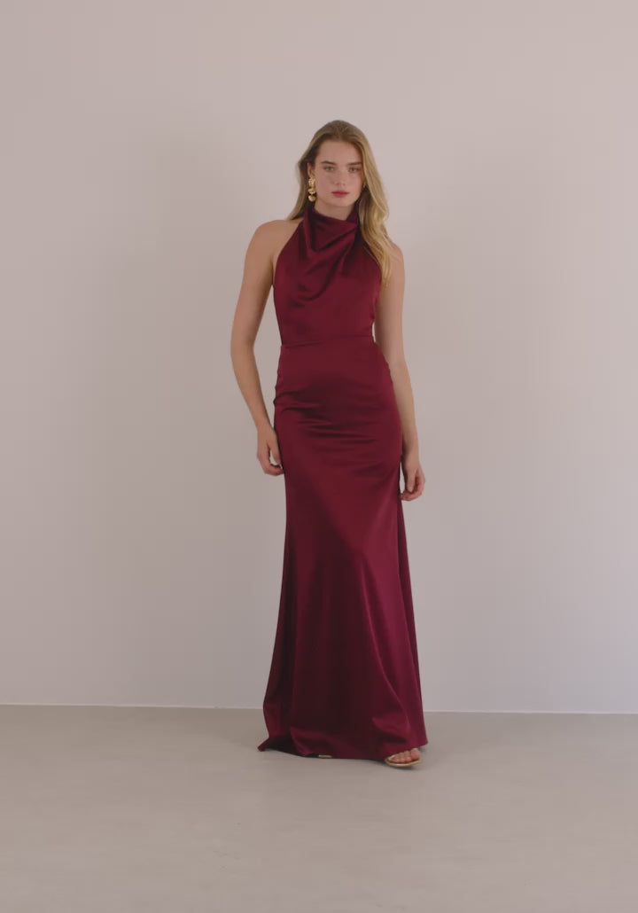 Μακρύ φόρεμα από σατέν ύφασμα, λεπτομέρεια με halter λαιμόκοψη και εντυπωσιακή άνοιχτη πλάτη. Κλείσιμο στο πίσω μέρος του λαιμού με κουμπάκια και φερμουάρ στην μέση.