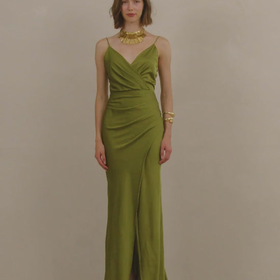 Maxi dress crafted from satin fabric. V-neckline with shoulder straps and a front side split design.