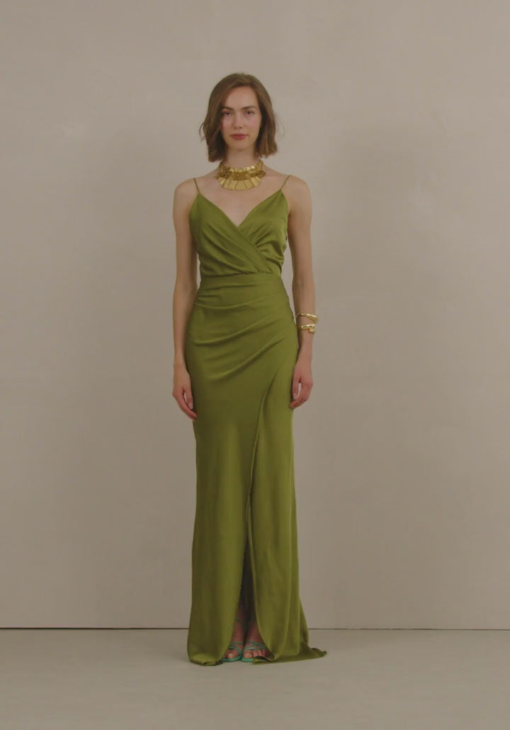 Μακρύ φόρεμα από σατέν ύφασμα. V ντεκολτέ με τιράντες και εντυπωσιακό σχέδιο στο μπροστινό μέρος. Άνοιγμα στο πλάι.