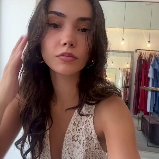 Elegant long muslin dress with a stunning bodice with sequined lace and a V-neckline. Detail with a central knot and cut-outs on the side. Back zipper closure.