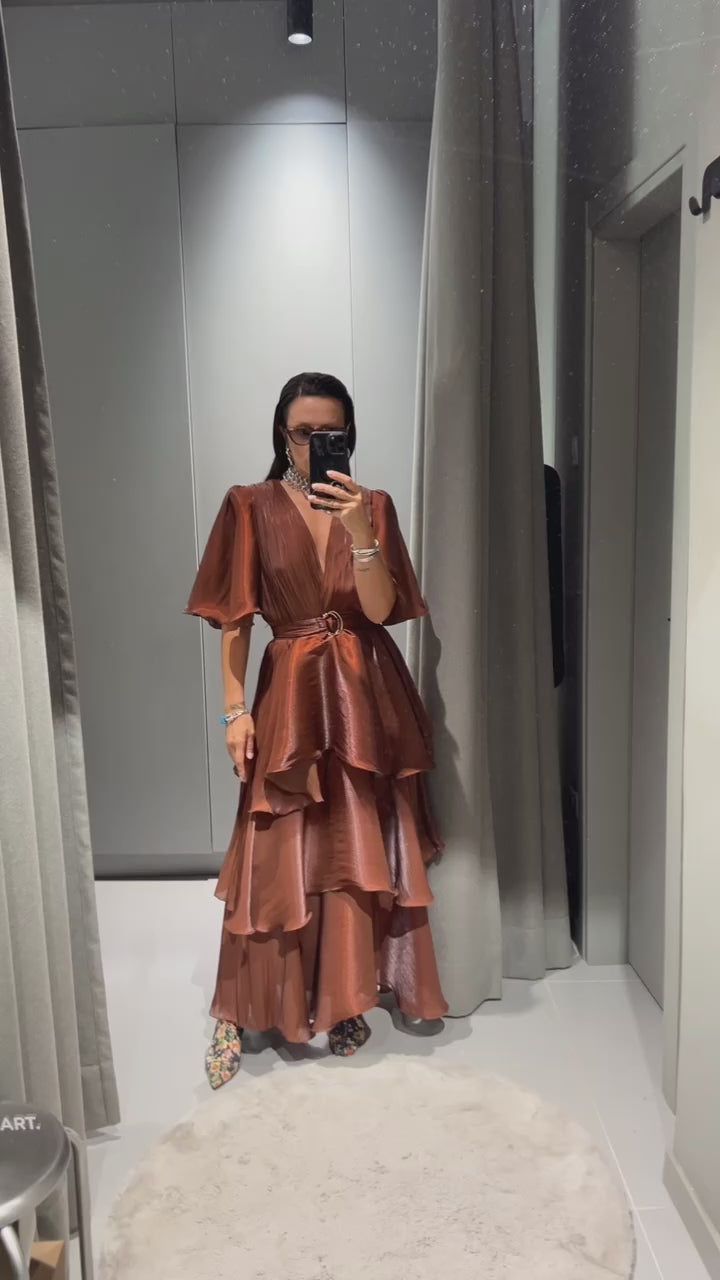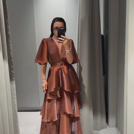 Εντυπωσιακό φόρεμα με τριπλό ασύμμετρο βολάν, έντονους ώμους και βάτες, βολάν μανίκια που καλύπτουν το μπράτσο, εσωτερική φόδρα στο στήθος, τύπου κρουαζέ, έρχεται με μεταλλική ζώνη στο ίδιο υλικό.