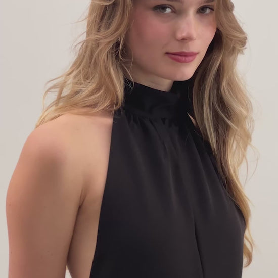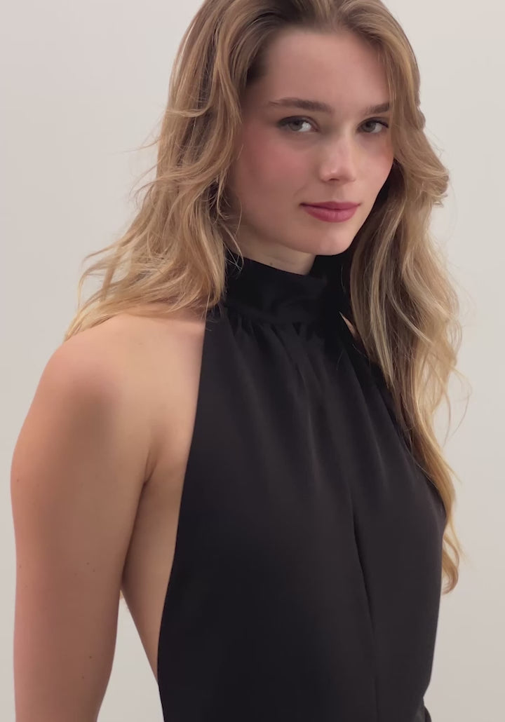 Striking and modern, the Noor jumpsuit is the ultimate statement piece for any special occasion. Crafted from crepe fabric with a soft texture, it offers elegance and a flawless fit. Featuring a high neckline, a bold front cutout, and an impressive open back, it exudes a sense of understated sensuality. Perfect for evening outings, formal events, or cocktail parties, the Noor combines strength, femininity, and contemporary sophistication.