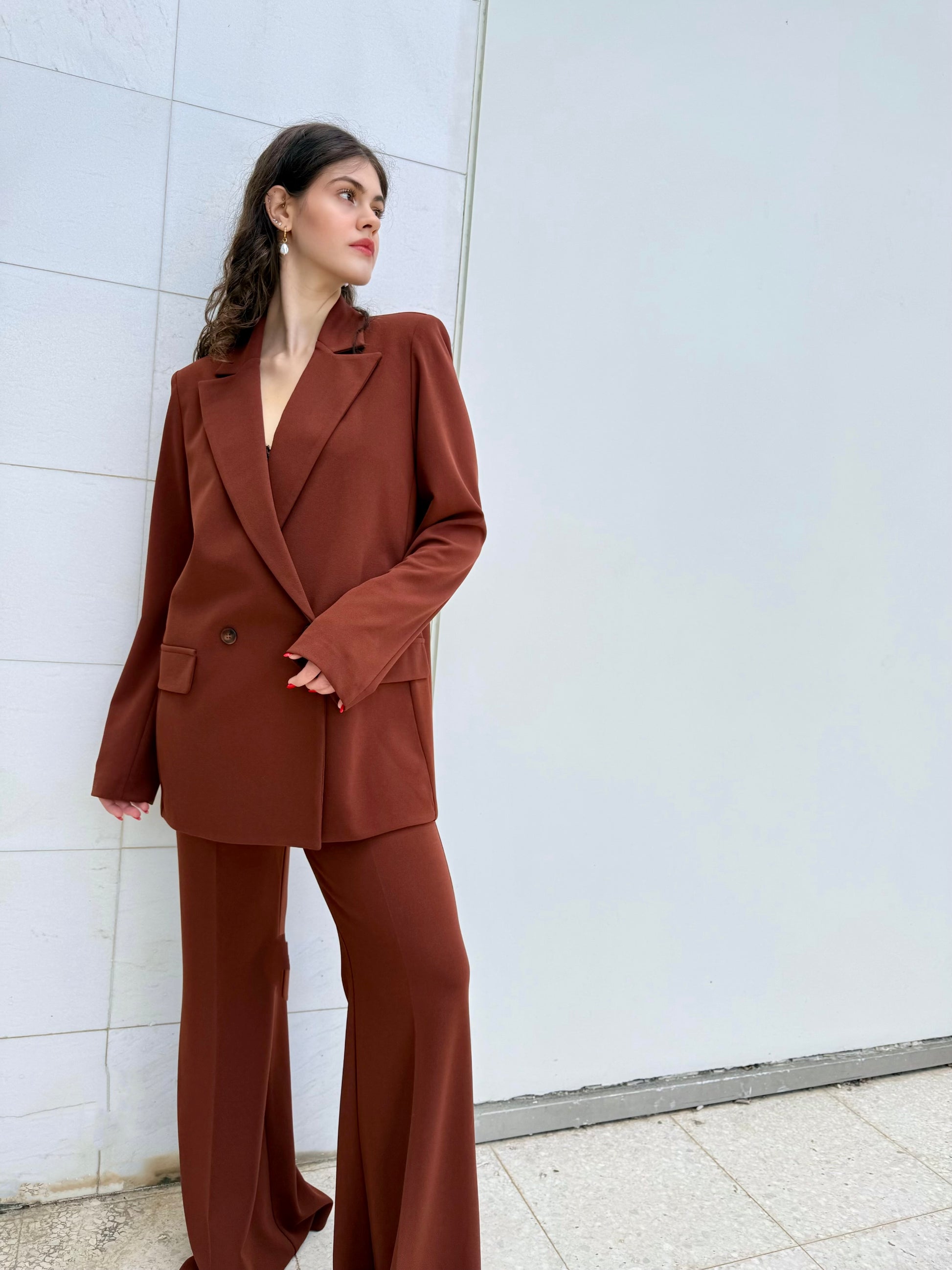 High-waist straight trousers with gentle stretch. Minimal design and fluid fit for modern elegance.