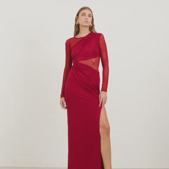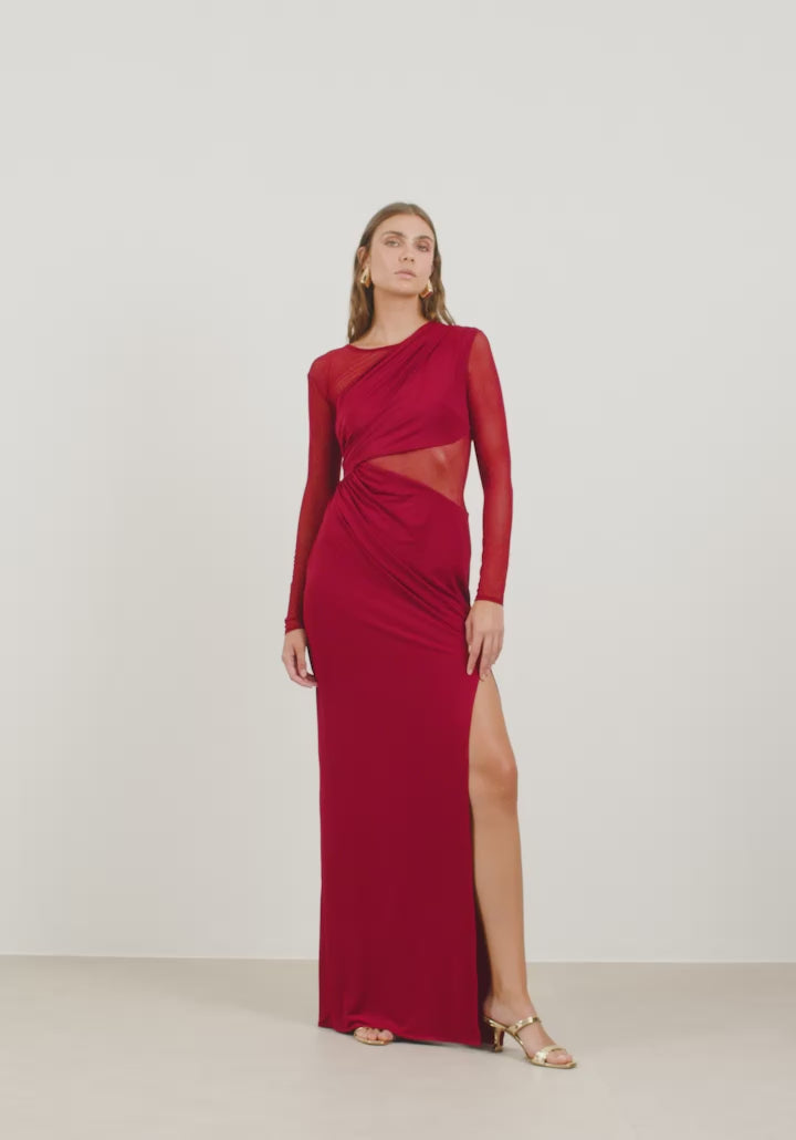 Our Penelope Dress is maxi crafted from elastic fabric with impressive long sheer sleeve detail, slit on the front & zipper on the side. Take your true size.