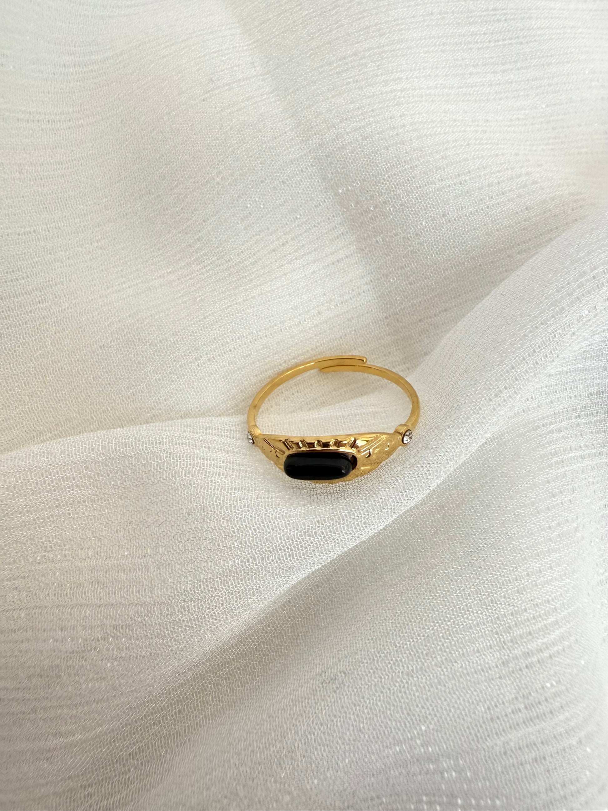 Gold ring with engraved detail and a small black stone. Delicate with a bold twist — perfect for everyday or stacking.