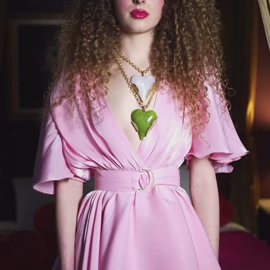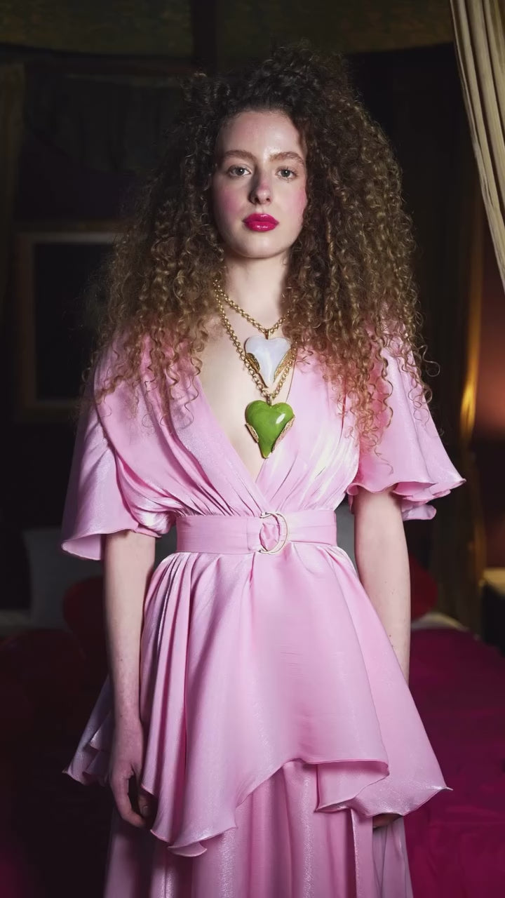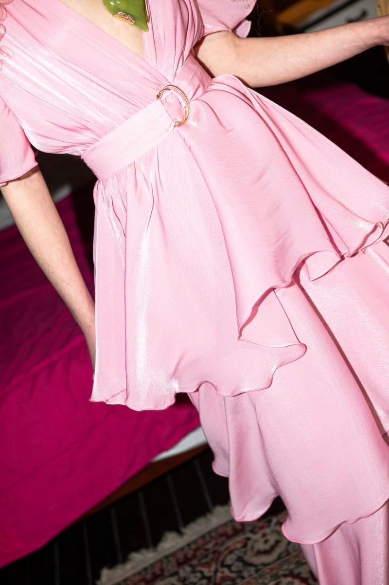 Statement dress featuring triple asymmetric ruffles, structured shoulders with padding, and ruffle sleeves that cover the arms. It includes an inner bust lining, a wrap-style design, and comes with a metallic belt in the same material.