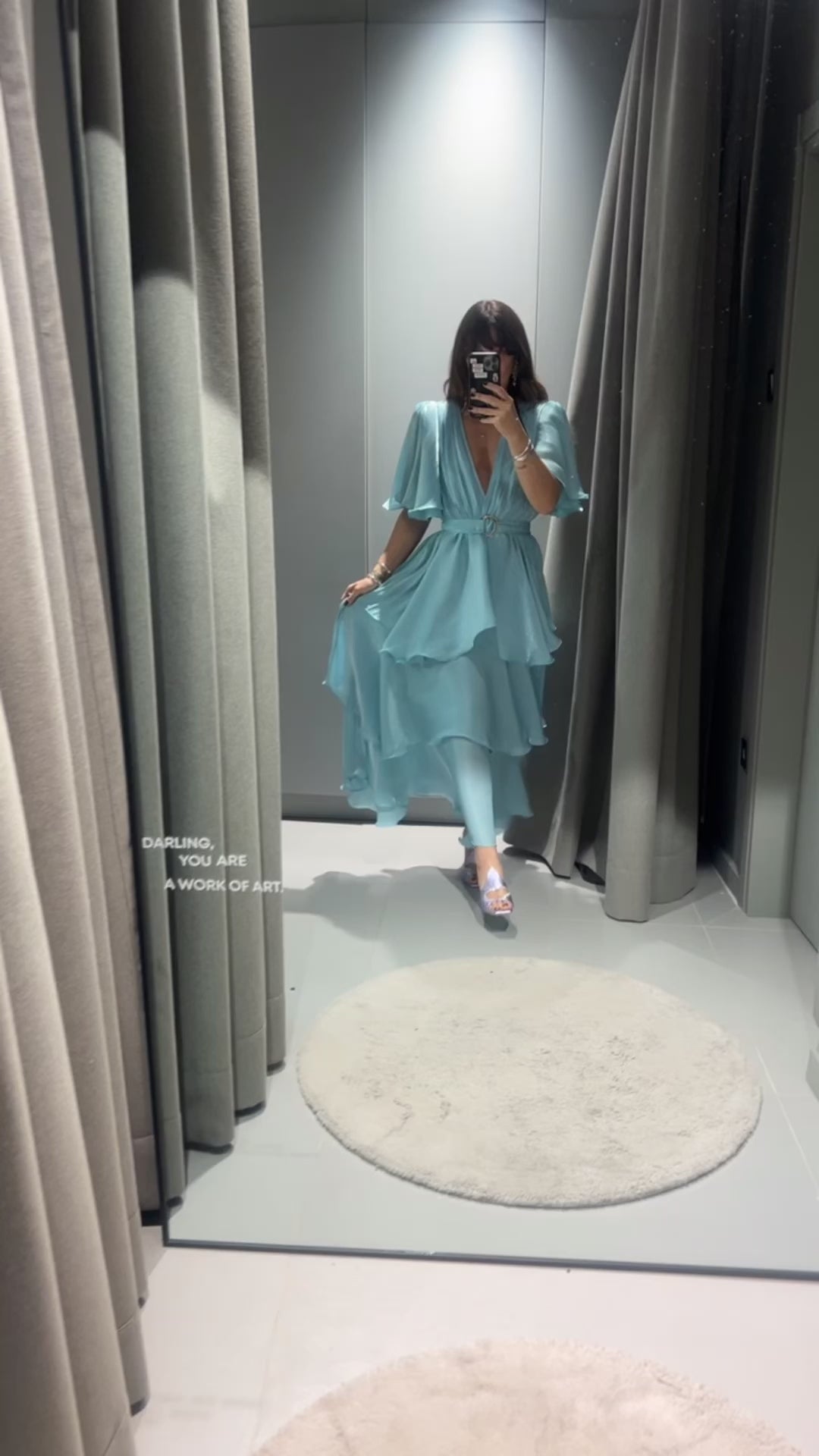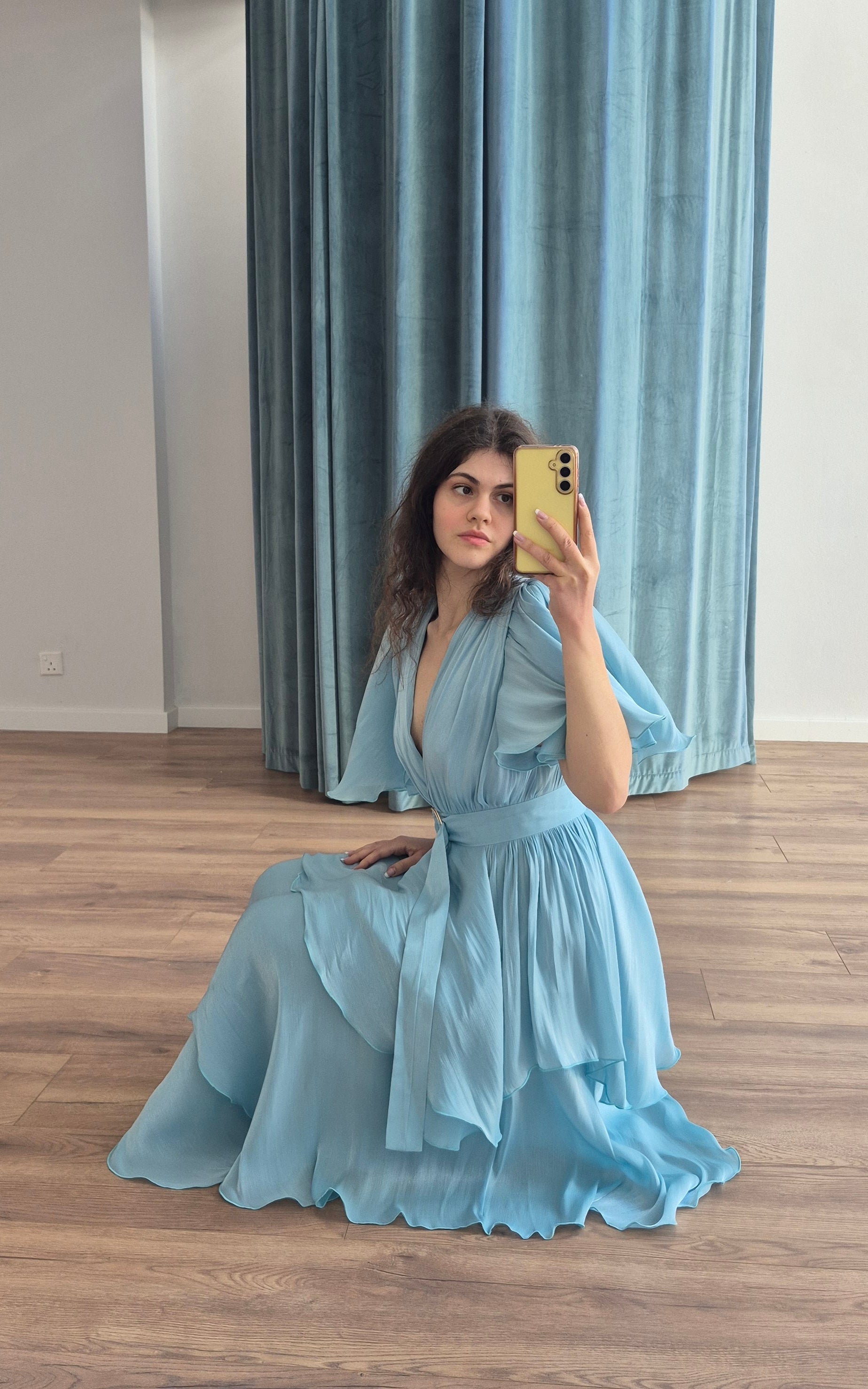 Statement dress featuring triple asymmetric ruffles, structured shoulders with padding, and ruffle sleeves that cover the arms. It includes an inner bust lining, a wrap-style design, and comes with a metallic belt in the same material.