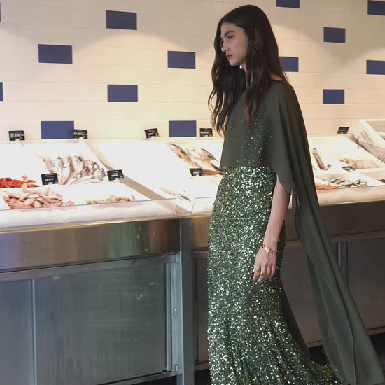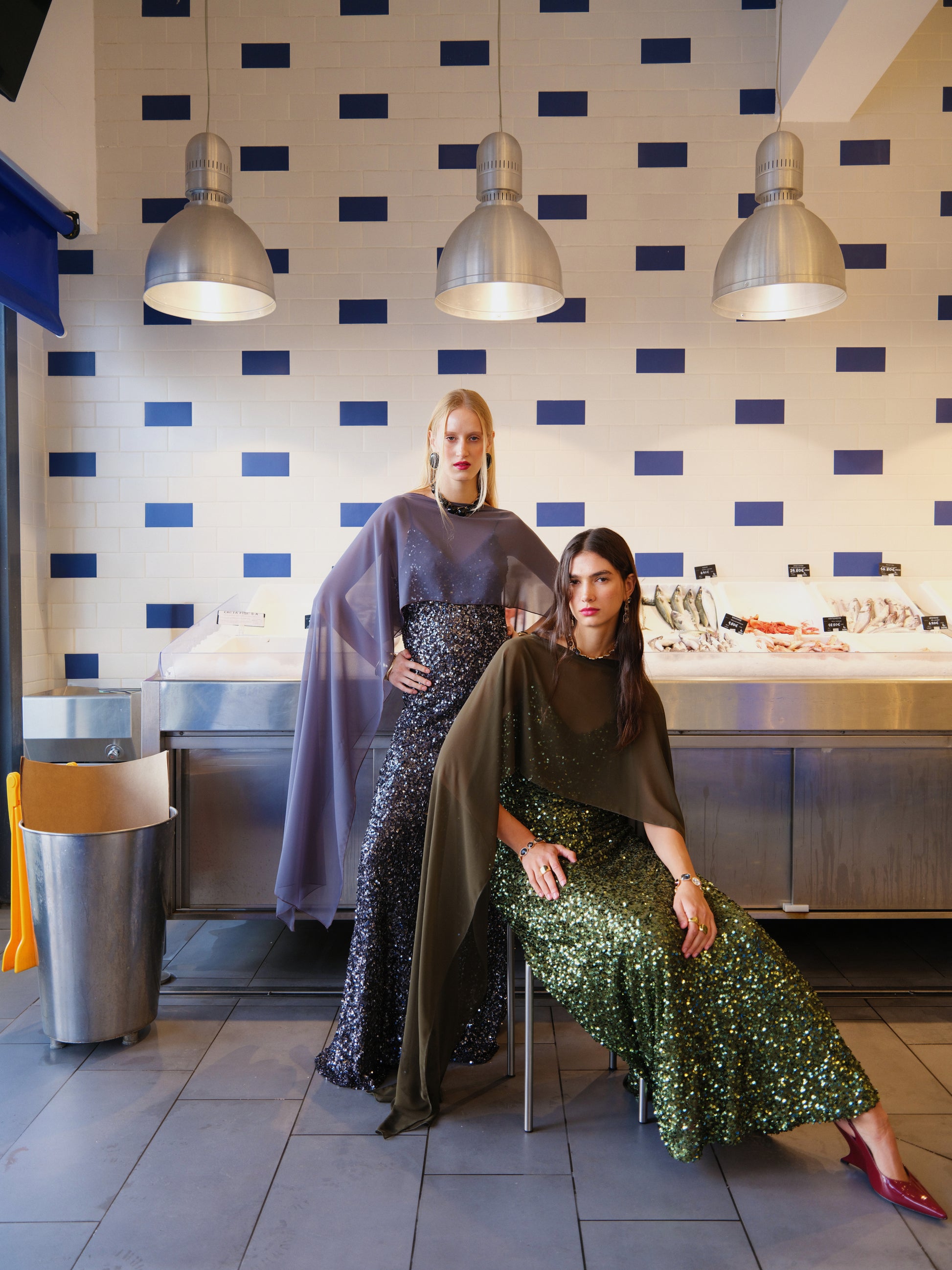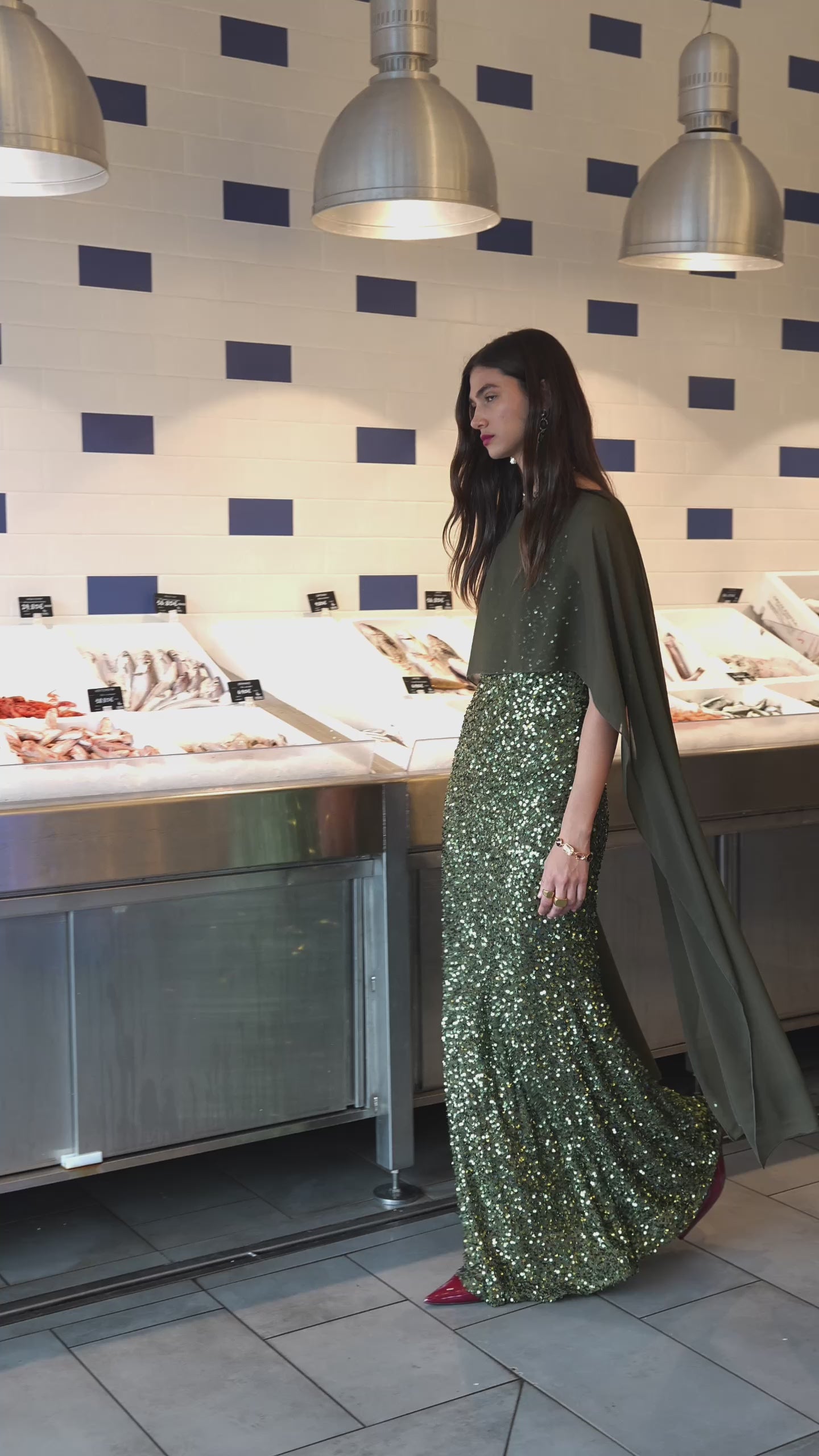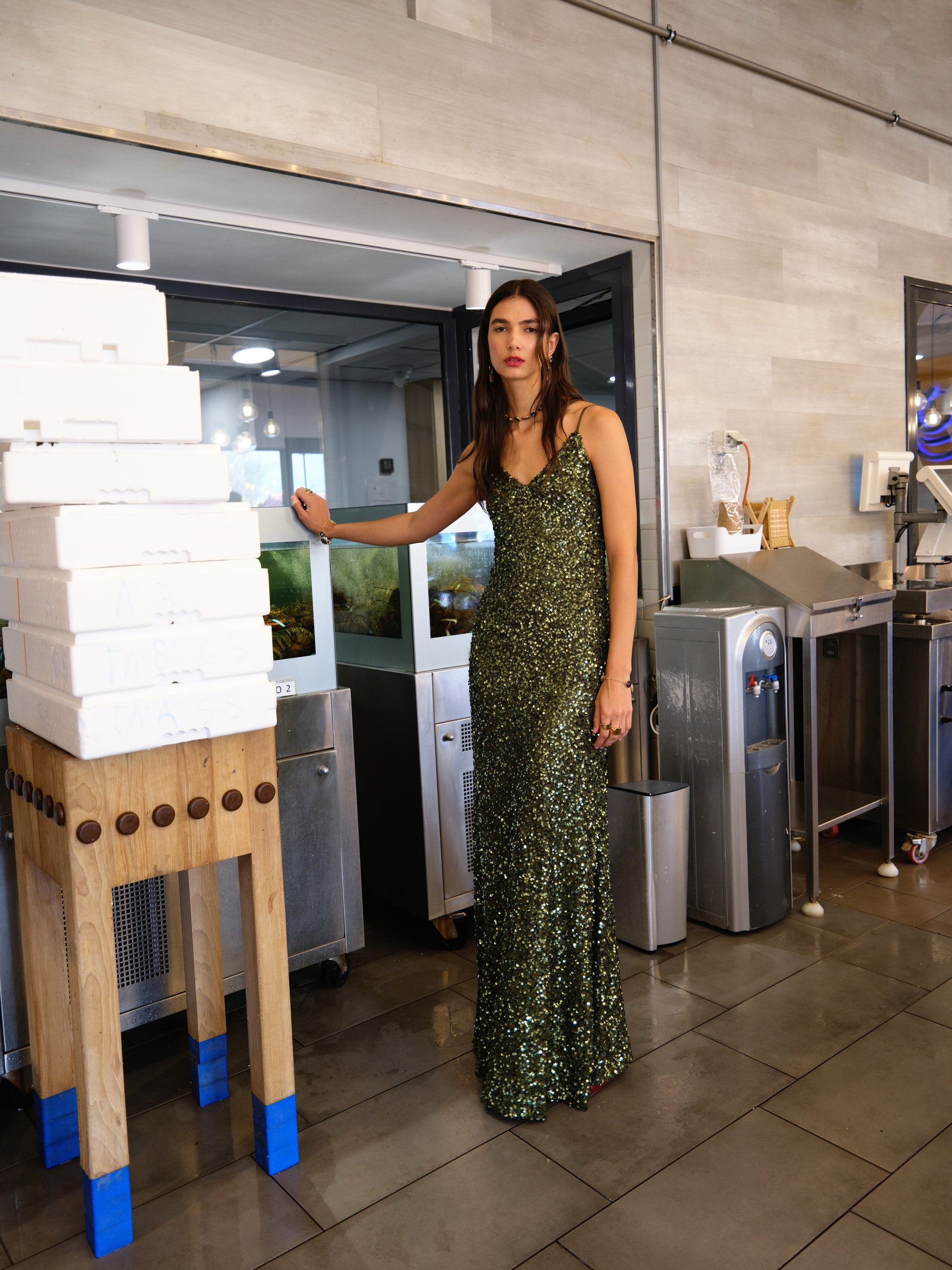 Βραδινό φόρεμα από ελαστική παγιέτα, εξώπλατο με ρυθμιζόμενες τιράντες, V εμπρός. Φοδραρισμένο.