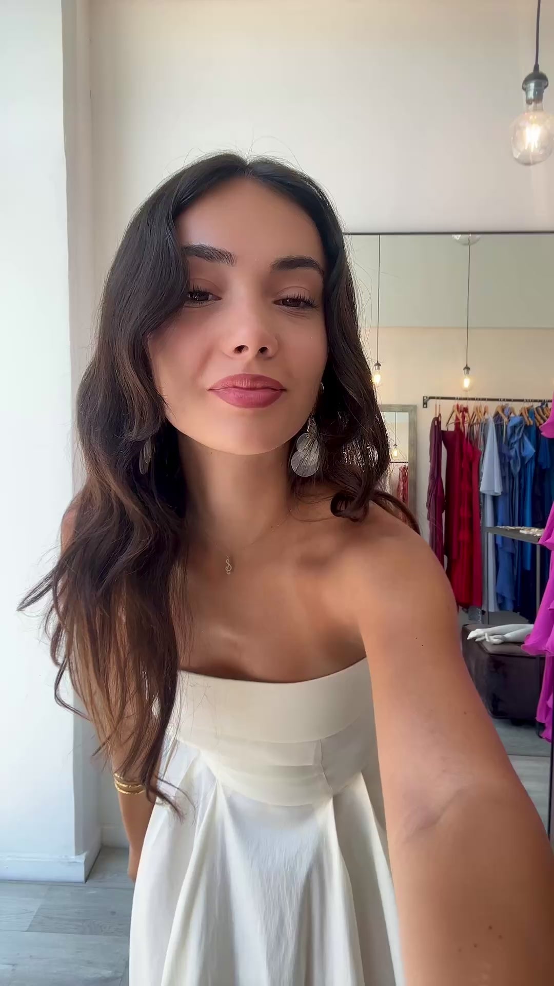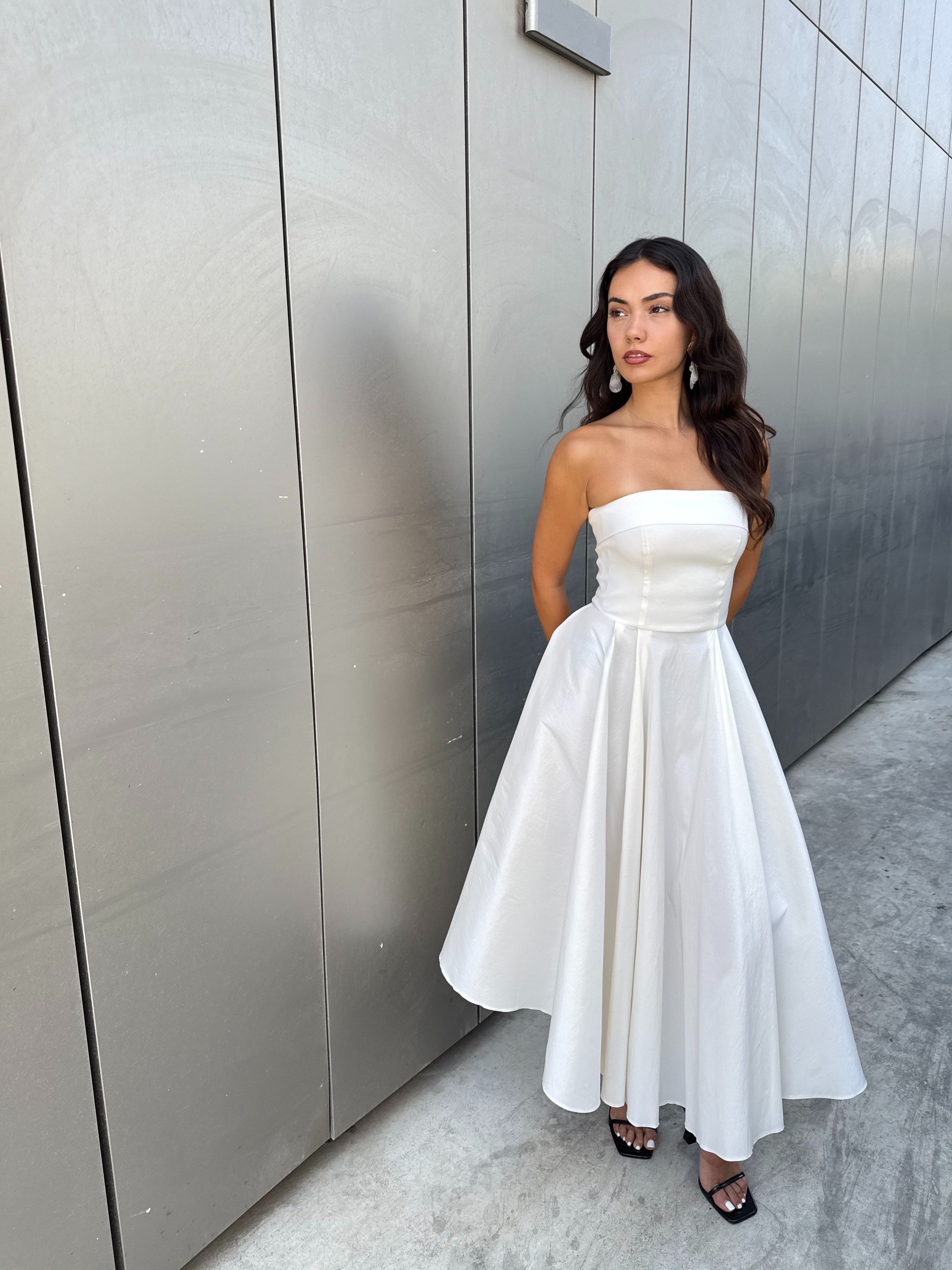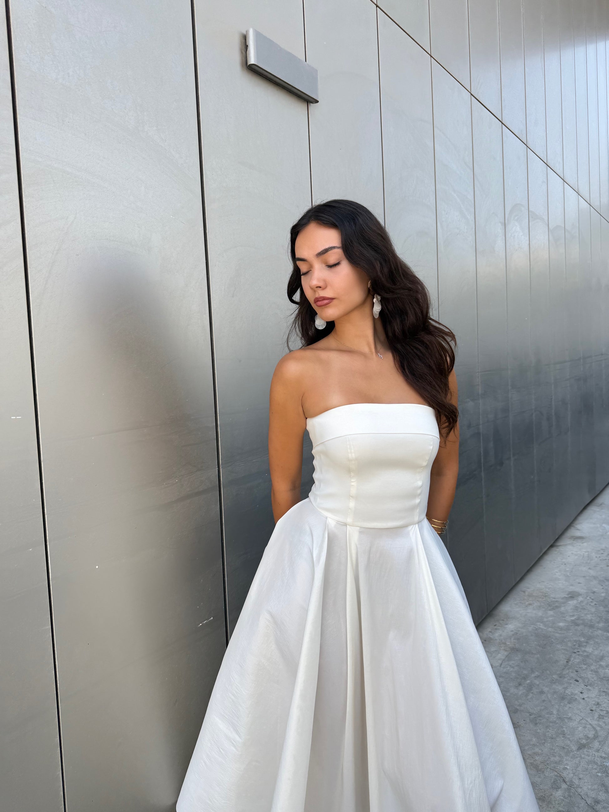 Elegant taffeta dress with an ankle-length asymmetric hem, blending romance and sophistication. The strapless bodice highlights the shoulders, while the A-line silhouette and soft pleats add graceful movement. Finished with pockets for a modern twist.