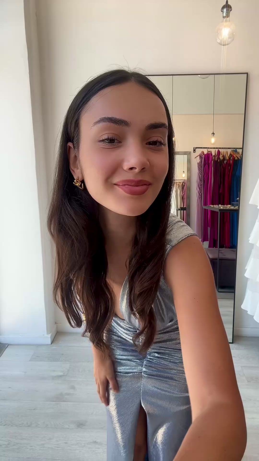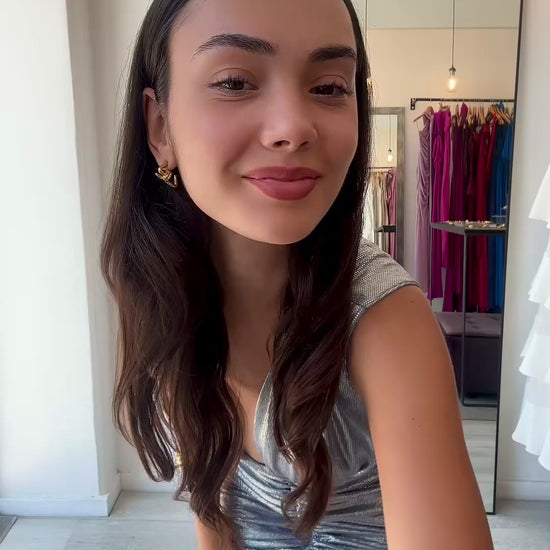 Maxi dress in stretchy, metallic fabric that catches the light beautifully. Featuring a deep V neckline, front ruching, and a thigh-high slit, it flatters the figure with elegance and bold charm. A true statement piece, perfect for glamorous evening occasions.