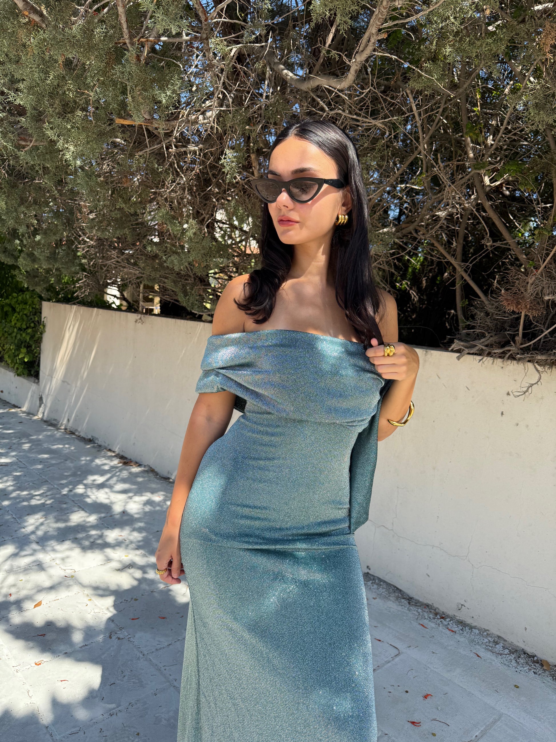 Μακρύ στράπλες φόρεμα από ελαστικό glitter ύφασμα, με ενσωματωμένο φουλάρι στο πλάι που φοριέται είτε γύρω από τον λαιμό είτε ριχτό σαν κάπα.