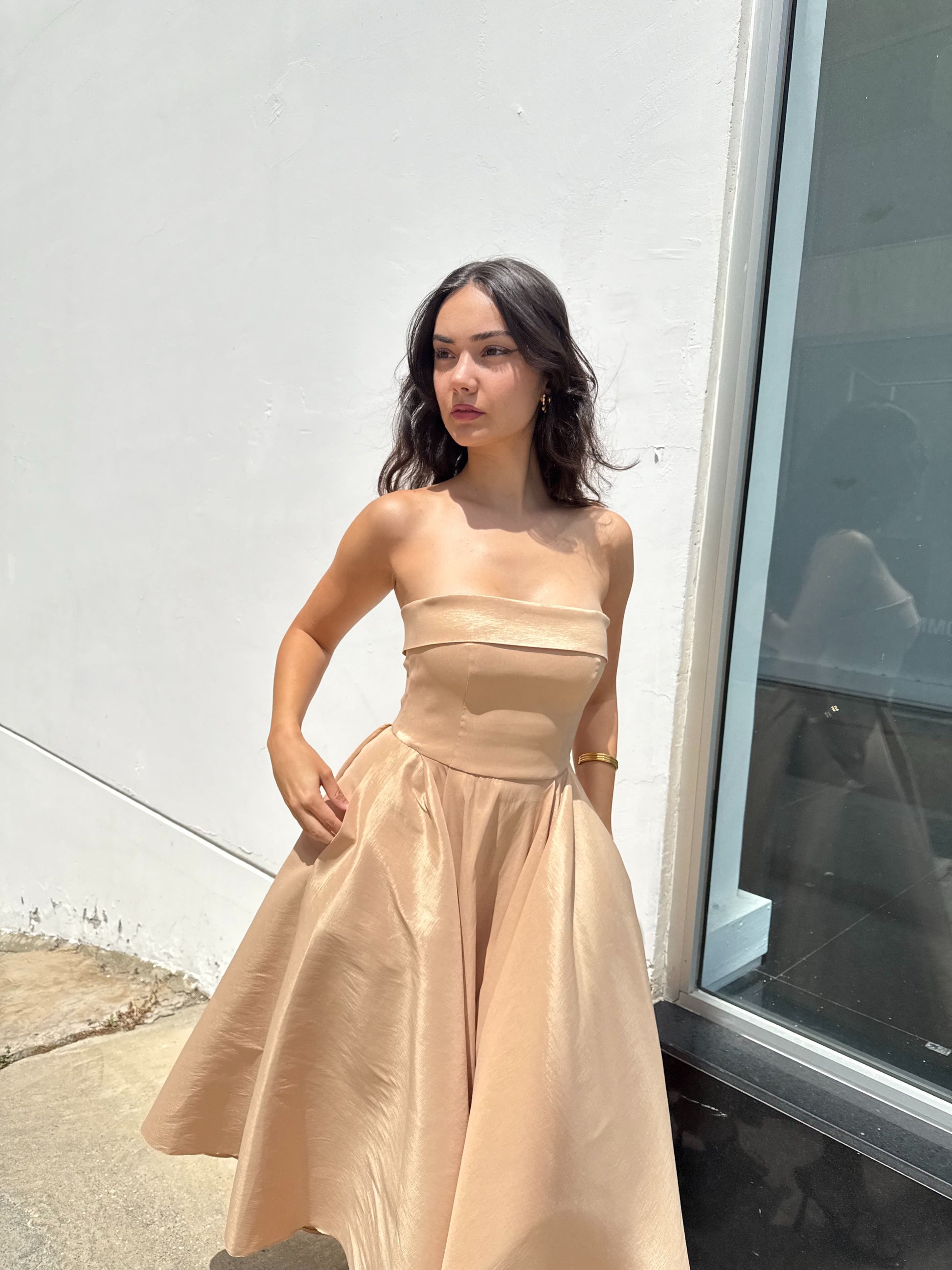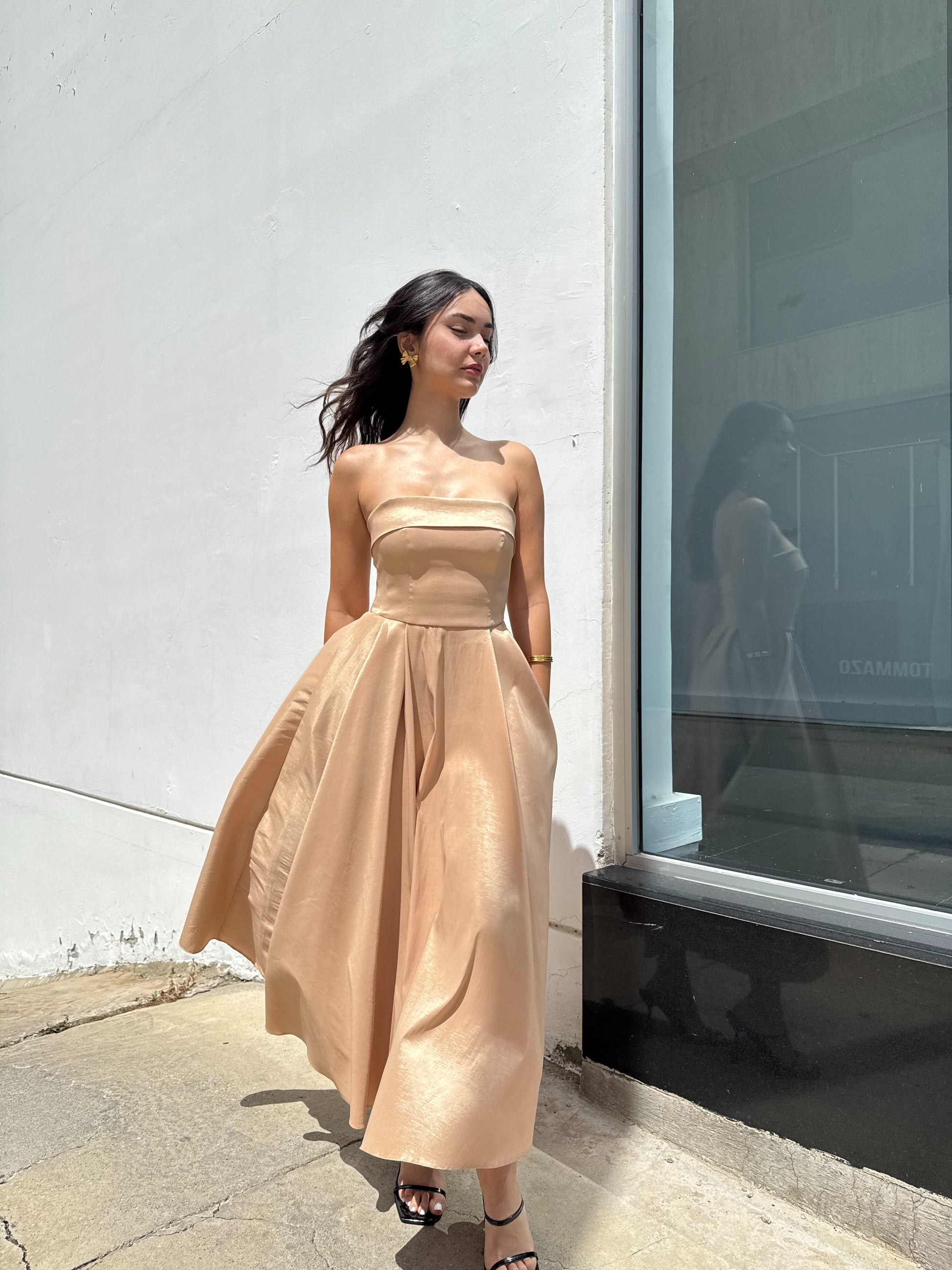 Elegant taffeta dress with an ankle-length asymmetric hem, blending romance and sophistication. The strapless bodice highlights the shoulders, while the A-line silhouette and soft pleats add graceful movement. Finished with pockets for a modern twist.