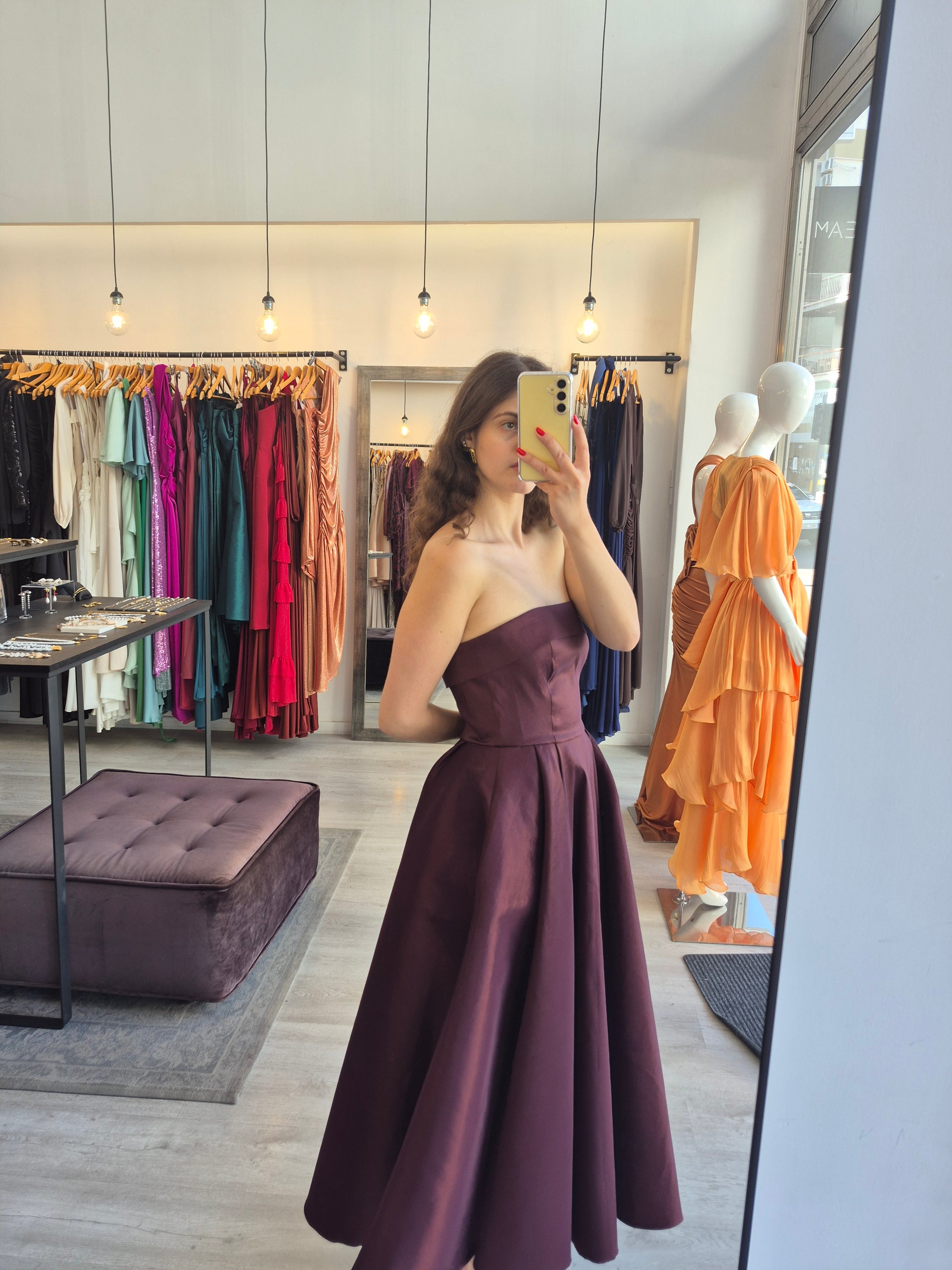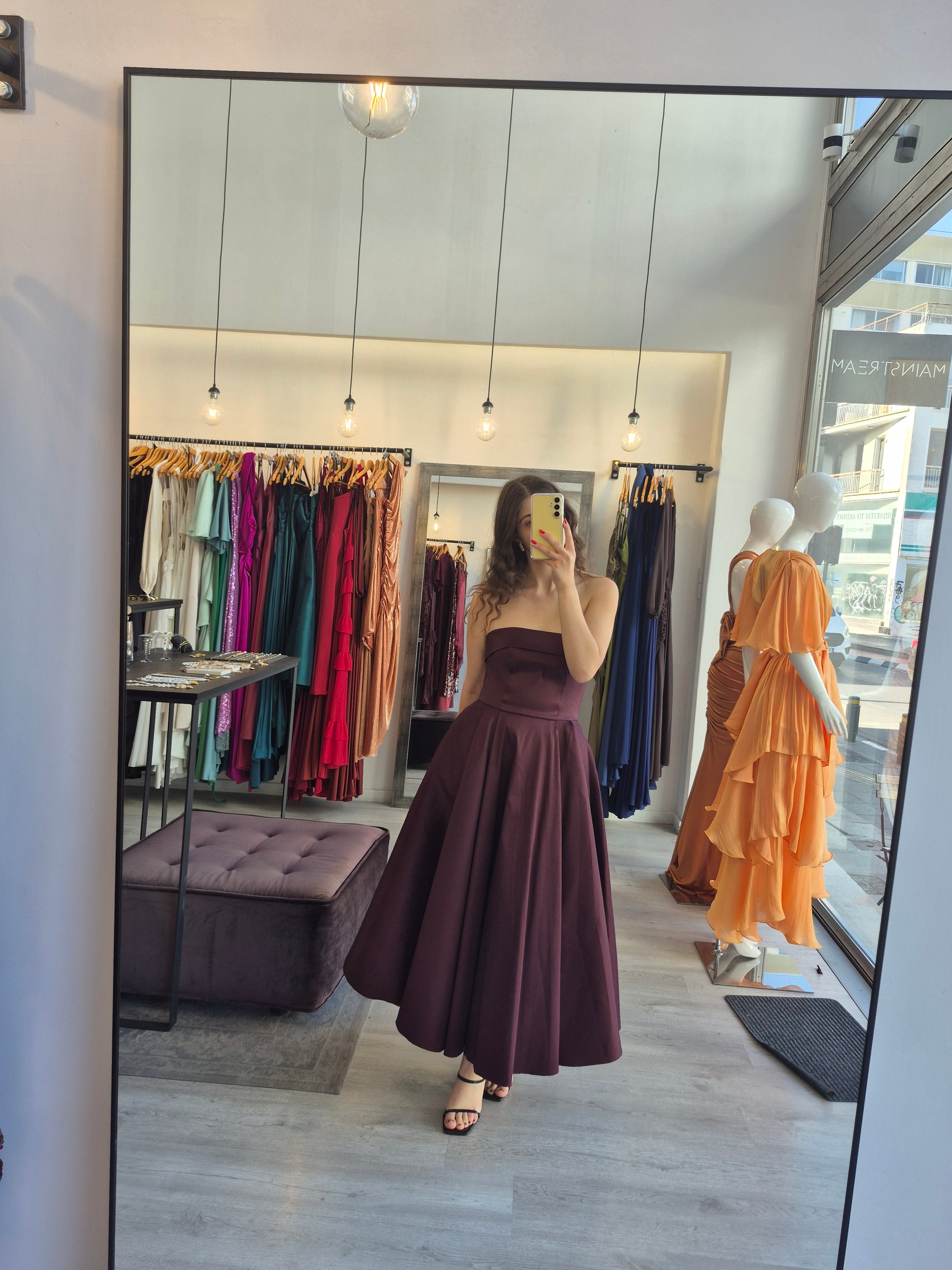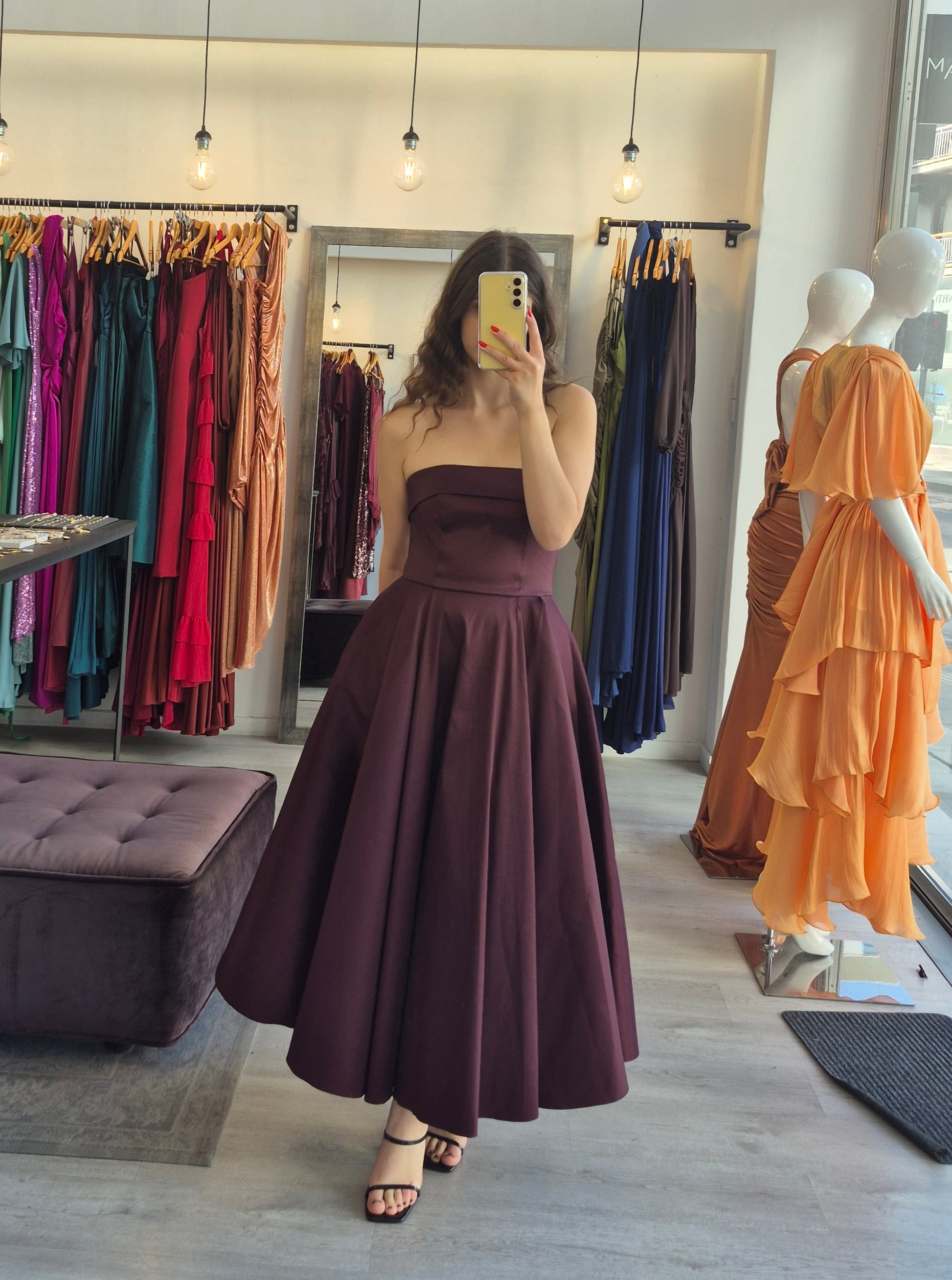 Elegant taffeta dress with an ankle-length asymmetric hem, blending romance and sophistication. The strapless bodice highlights the shoulders, while the A-line silhouette and soft pleats add graceful movement. Finished with pockets for a modern twist.