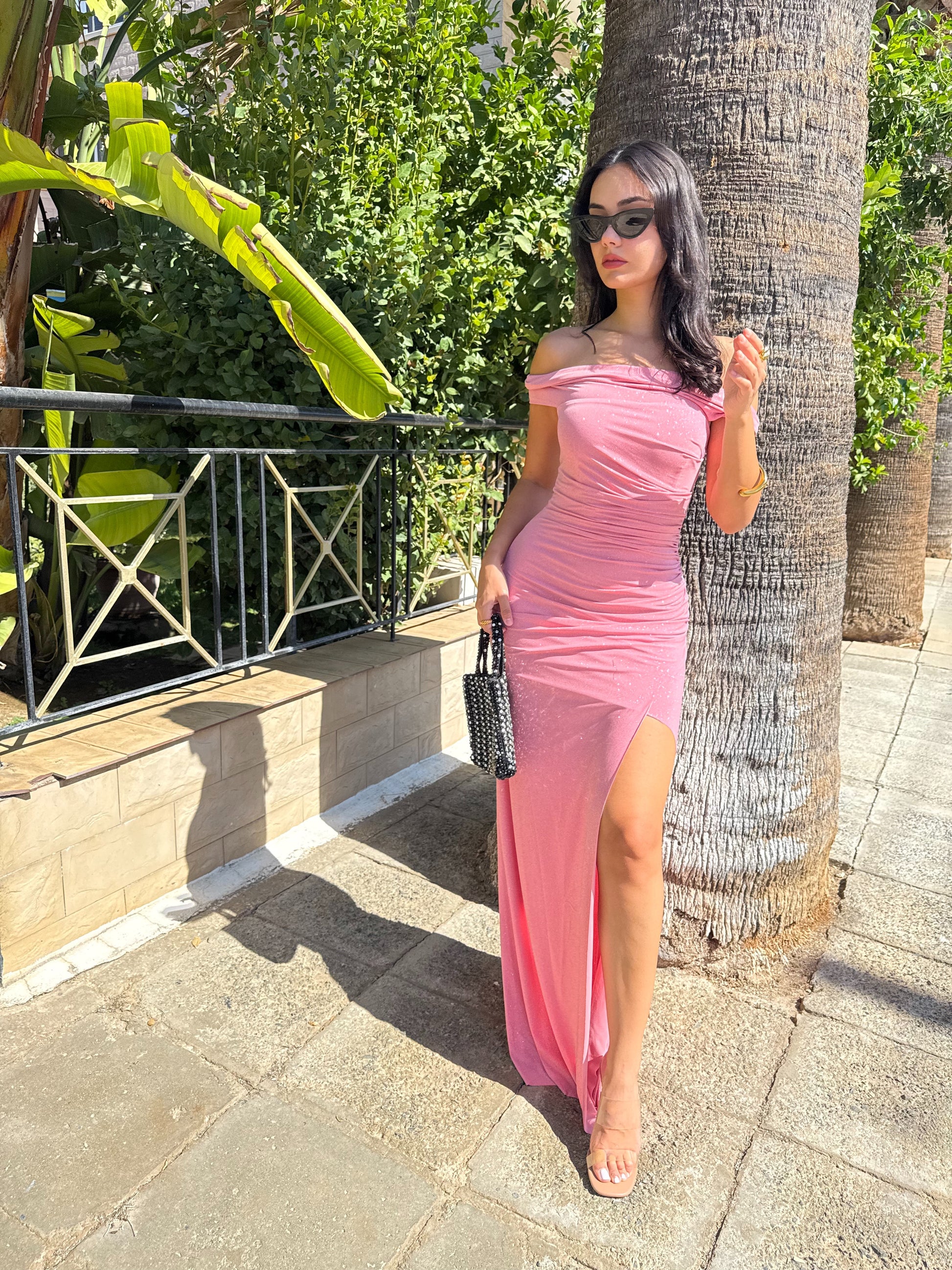 Μακρύ off shoulder φόρεμα με σκίσιμο στο πόδι, από ελαστικό ύφασμα με διακριτικές γκλίτερ λεπτομέρειες.